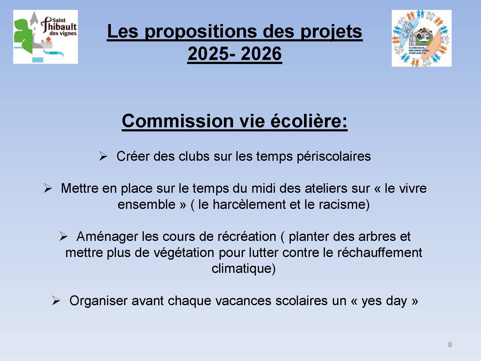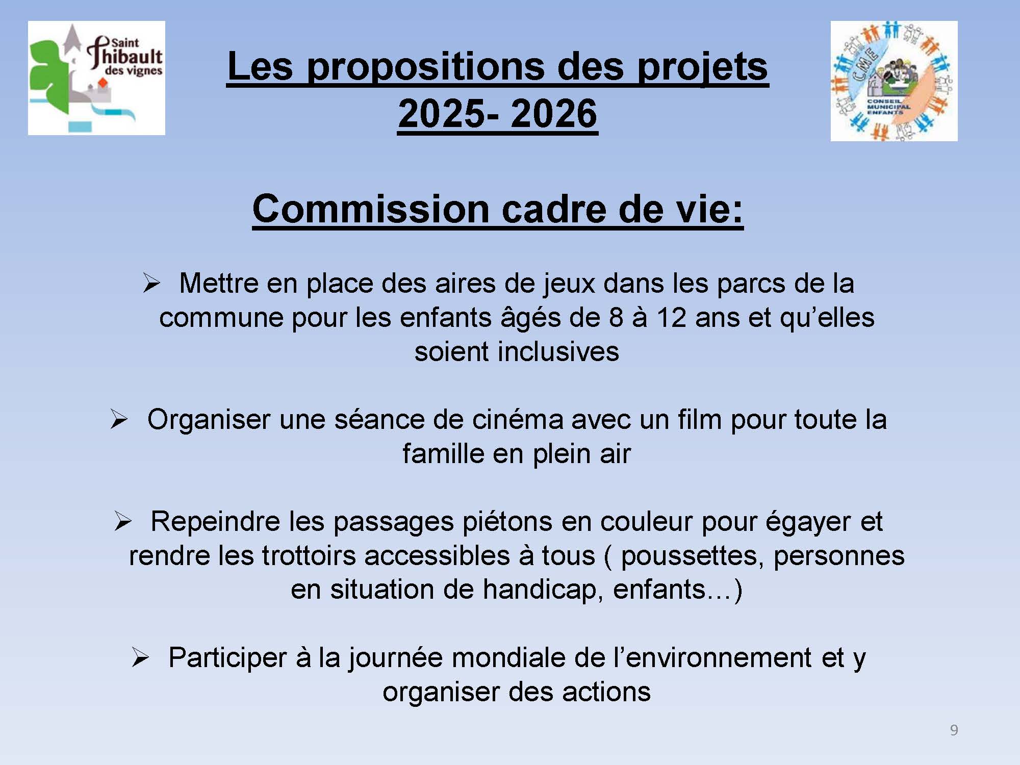Les deux idées essentielles d’un C.M.E, en terme d’identité sociale pour les jeunes enfants, sont d’une part d’agir, être acteur et représenter les autres enfants d’une même classe d’âge, et d’autre part, découvrir, apprendre et développer la citoyenneté au quotidien. Chaque année, les jeunes théobaldiens (cm1 /cm2) élisent leurs représentants au sein de trois commissions : vie scolaire, sport et loisirs, environnement et sécurité.