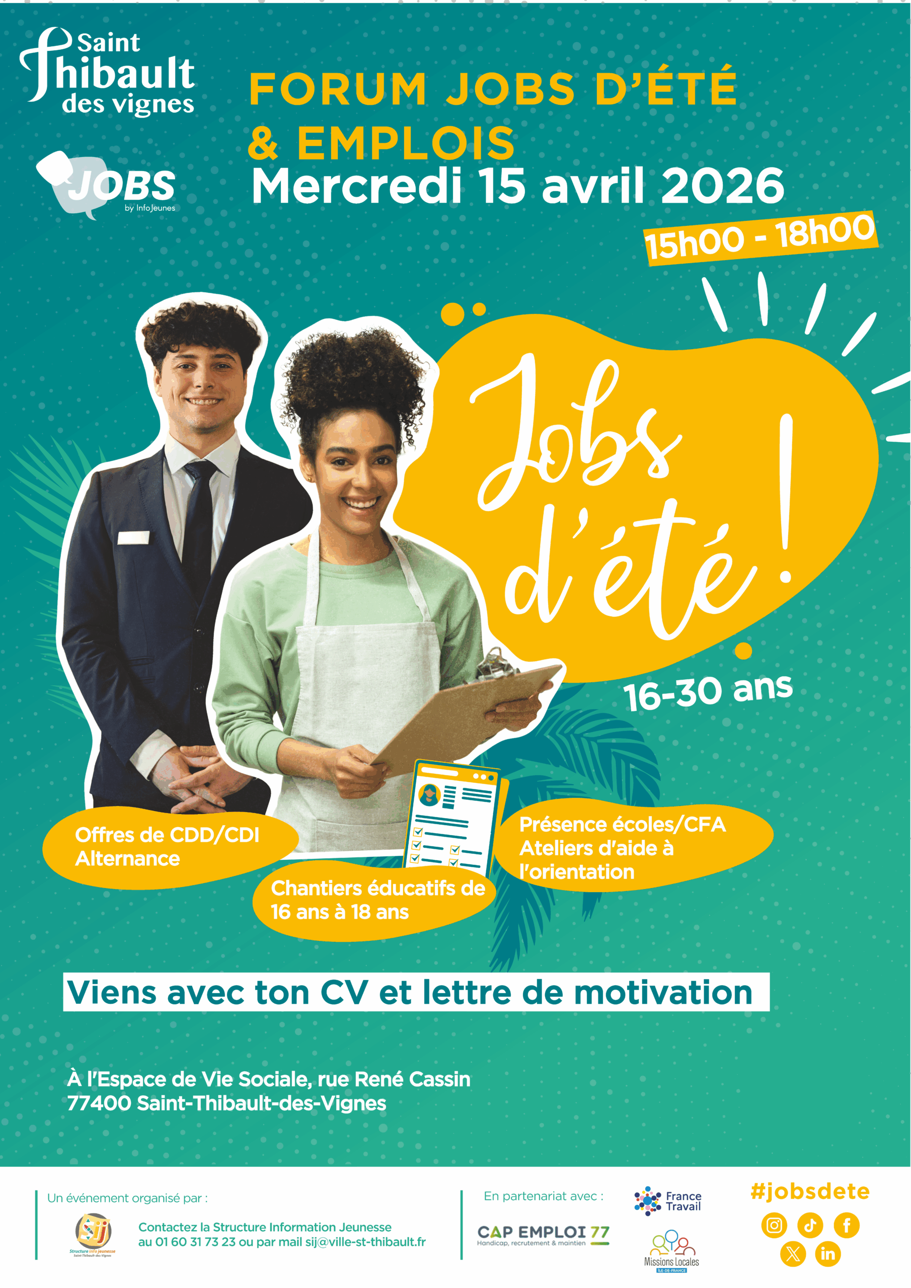 Saint-Thibault-des-Vignes propose le Forum jobs d’été & emplois le mercredi 15 avril 2026 de 15h00 à 18h00 pour les 16-30 ans . Offres de CDD/CDI, d’alternance – Chantiers éducatifs – Présence d’écoles et de CFA – Ateliers d’aide à l’orientation.